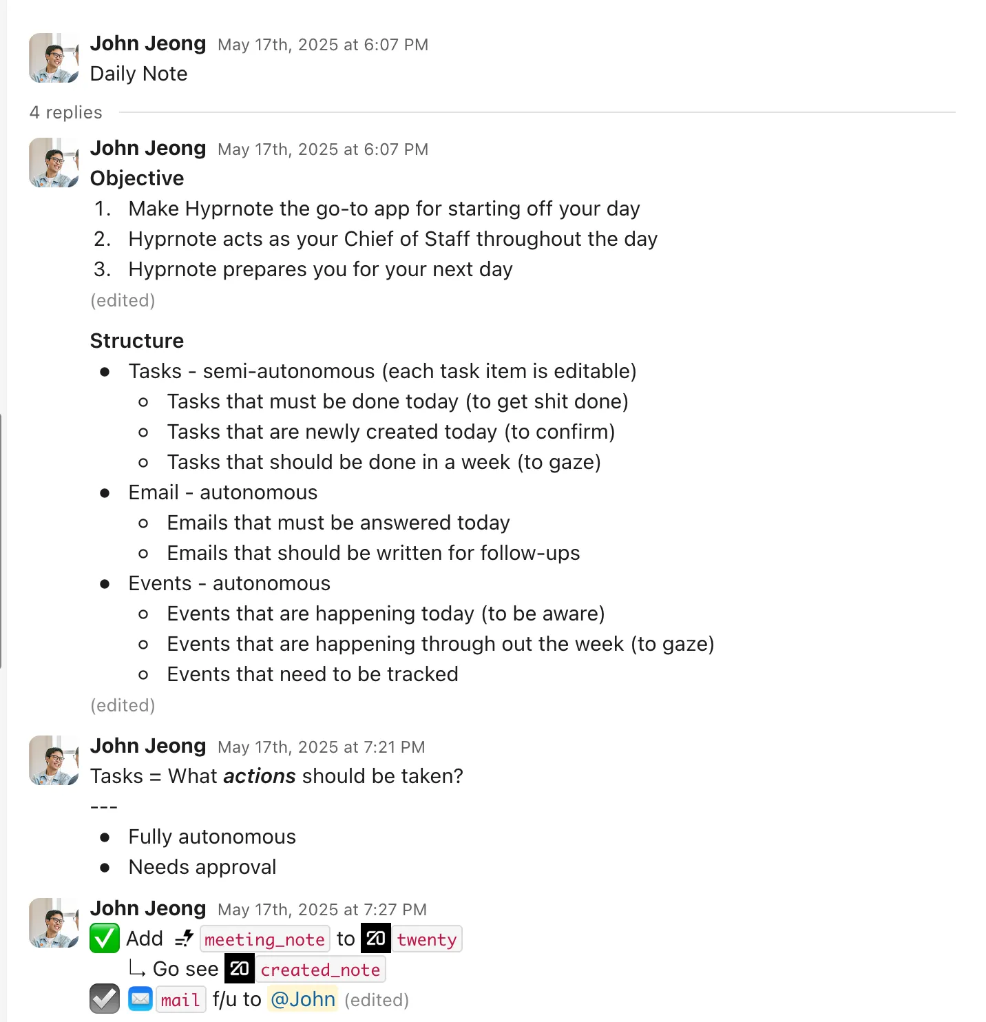 The full picture is still coming together — but the direction is clear. When everyone inside a team has their own daily note, those notes become a shared operating layer: context flows between people automatically, decisions leave a trail, and nothing falls through the cracks because the system remembers even when people don’t.
