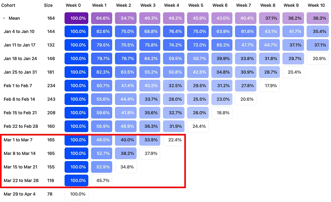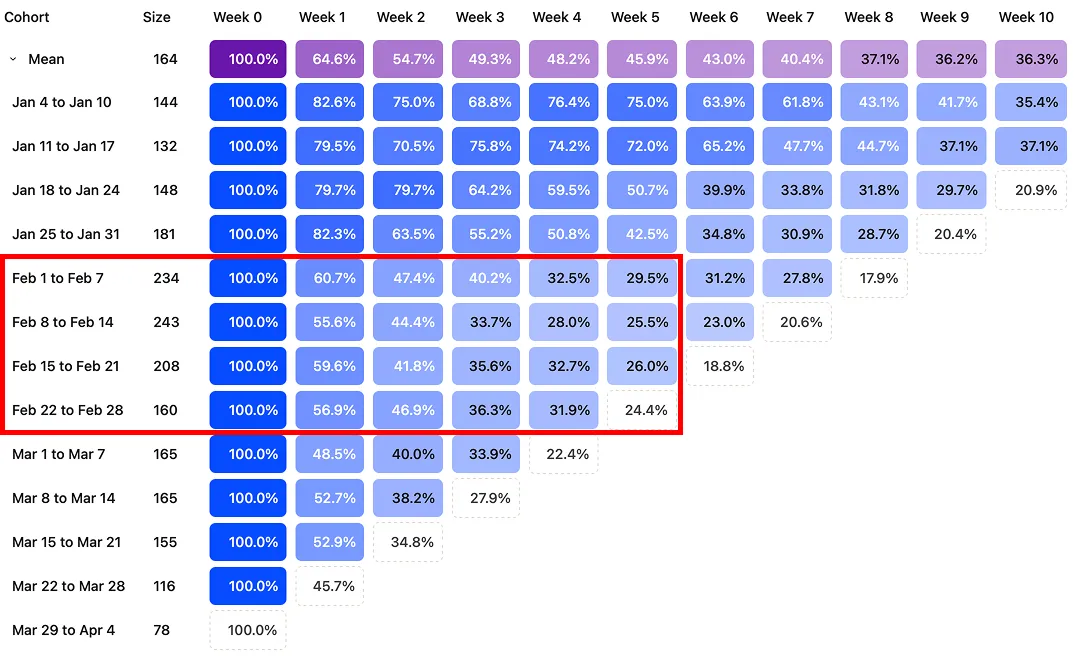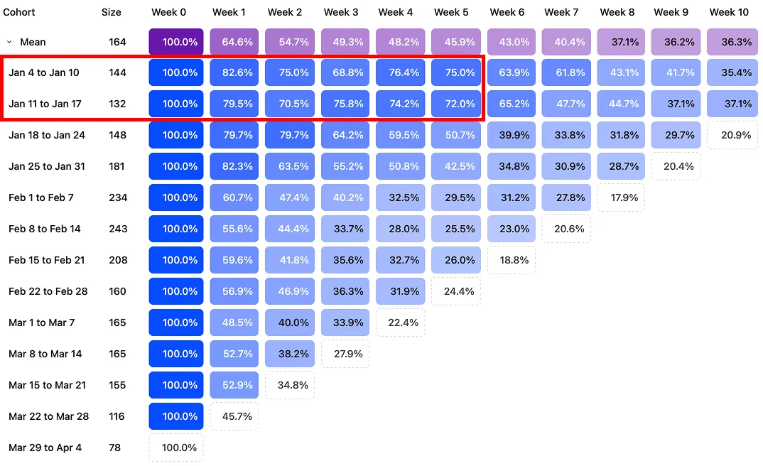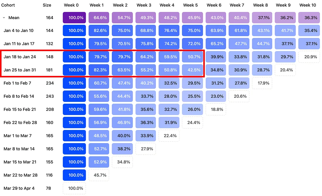 Our activation funnel was nearly nonexistent at launch, which meant only the most motivated users made it through. The result was record-high retention in that early cohort.
